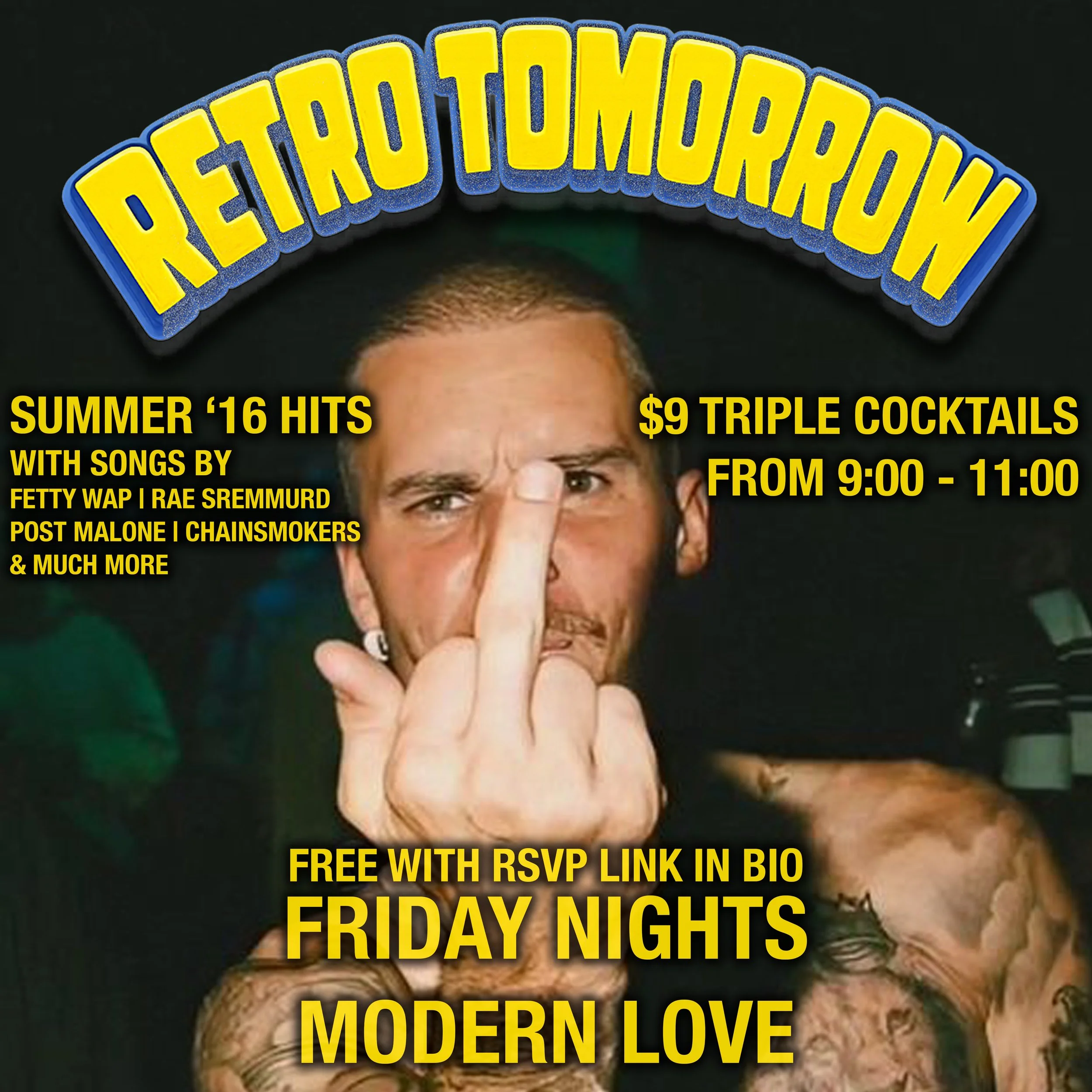 RETRO TOMORROW - FRIDAYS DOORS AT 9PM, $9 TRIPLE COCKTAILS FROM 9-11PM. JAMZ THROWBACK NIGHT - SATURDAYS DOORS AT 9PM GUESTLIST? No problem. Email ewan@modern-love.ca to hop on.